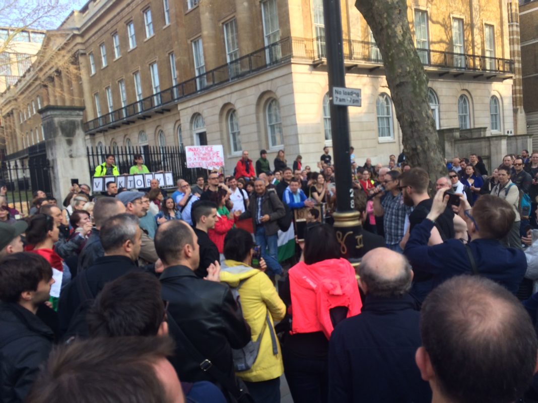 A londoni magyar demonstráción résztvevők a Független Hírügynökségnek elmondták, hogy mintegy 400 magyar gyűlt össze a Downing Streettel szemben, kreatív molinókkal, táblákkal. Sok a család, a baráti társaság, a fiatal. Rengeteg turista megáll és nézelődik. Az elhangzott beszédben a többi között azt ecsetelte a szónok, hogy Orbán 15 éve ugyanazt monda, mint amit ma ők ott, az ellene tüntetők. A londoni tüntetést egyidőben tartották a budapesti felvonulással, s több más nyugati városban – így Berlinben – szervezett demonstrációval.